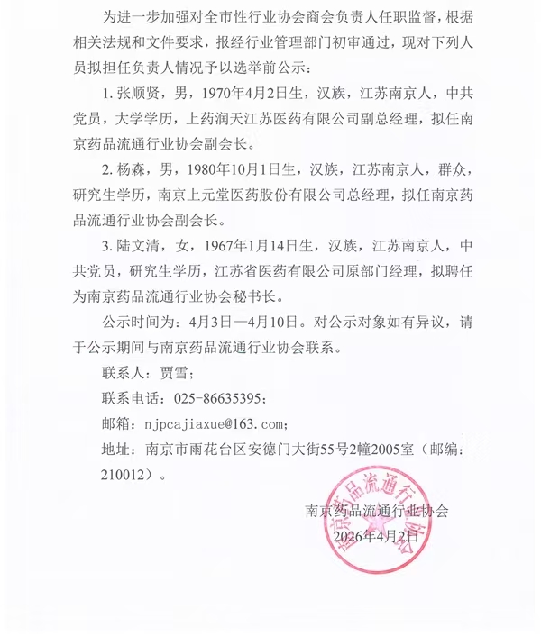南京药品流通行业协会负责人人选公示